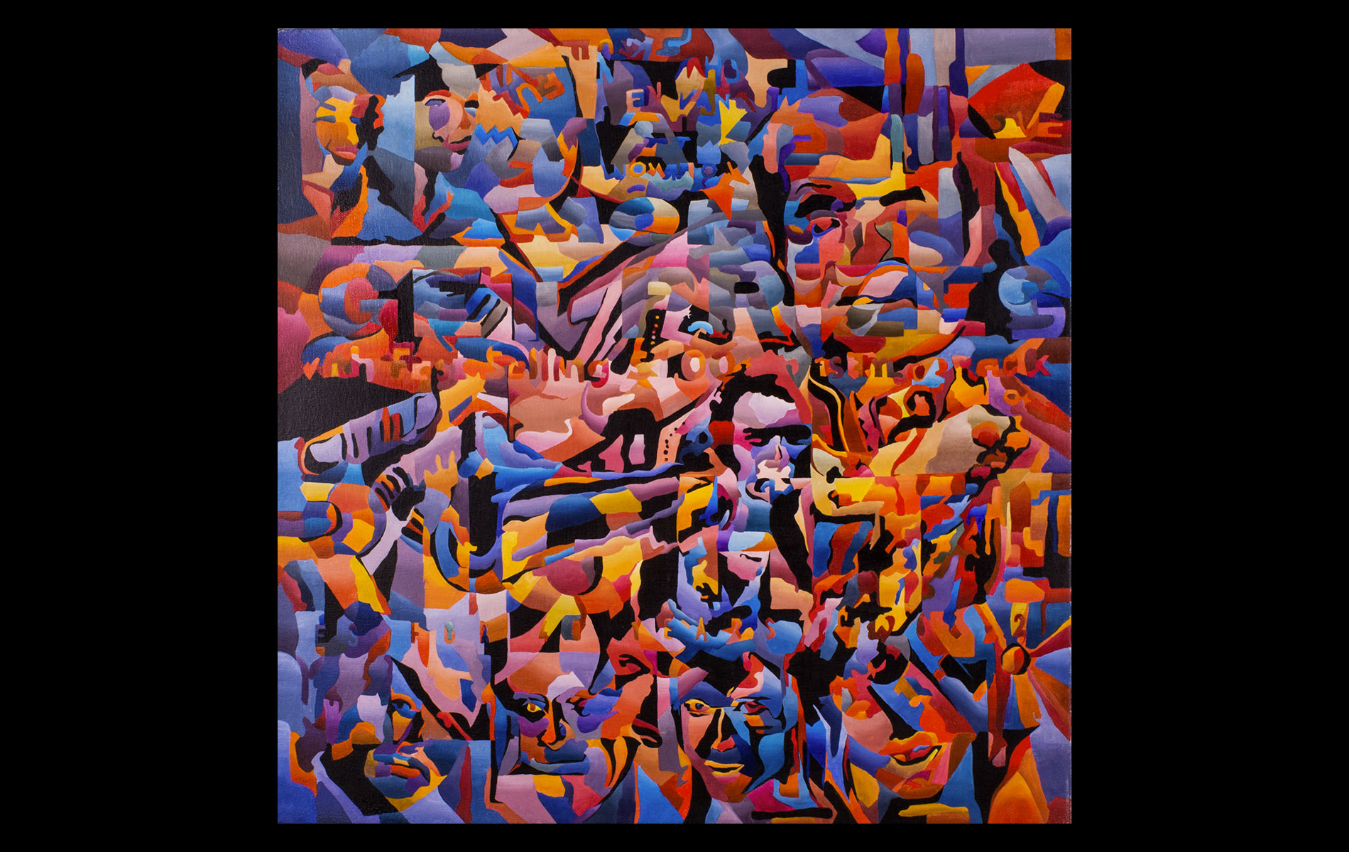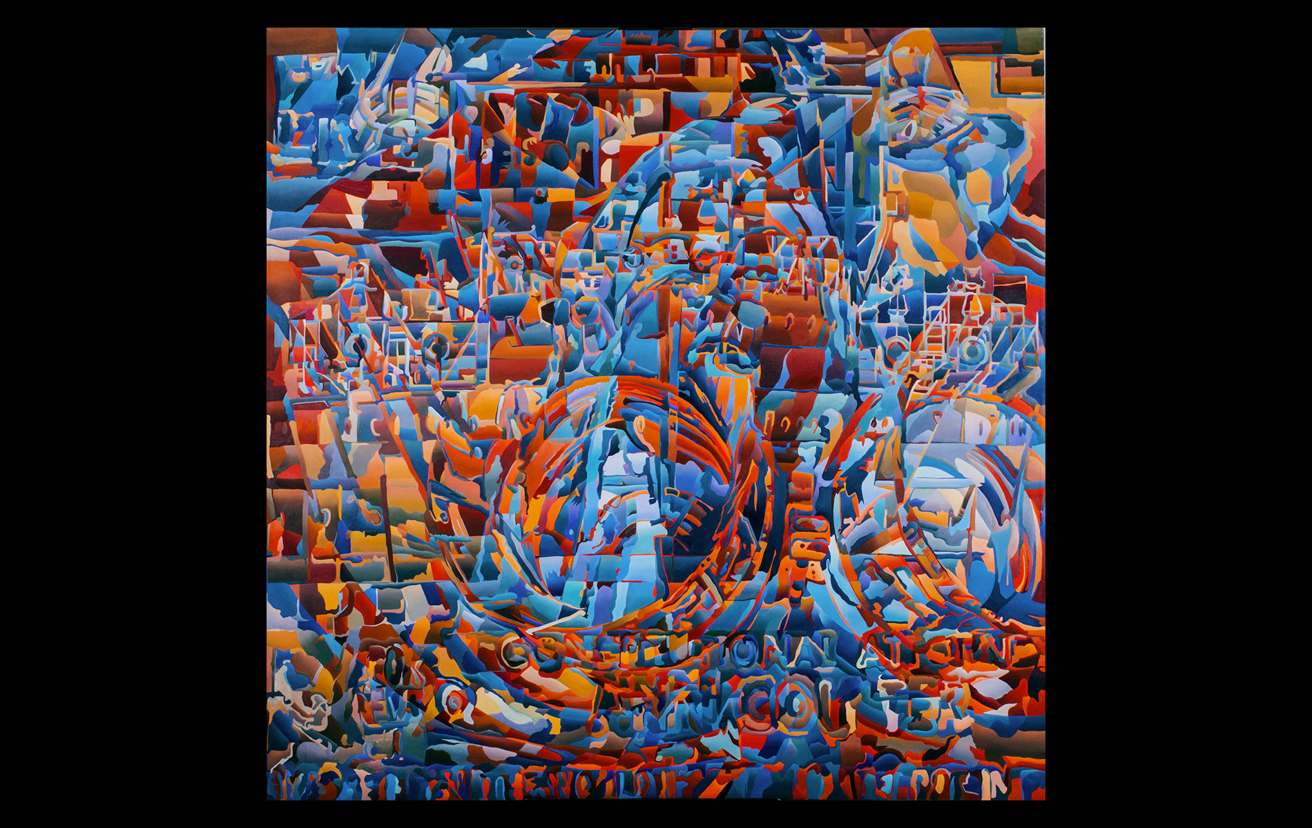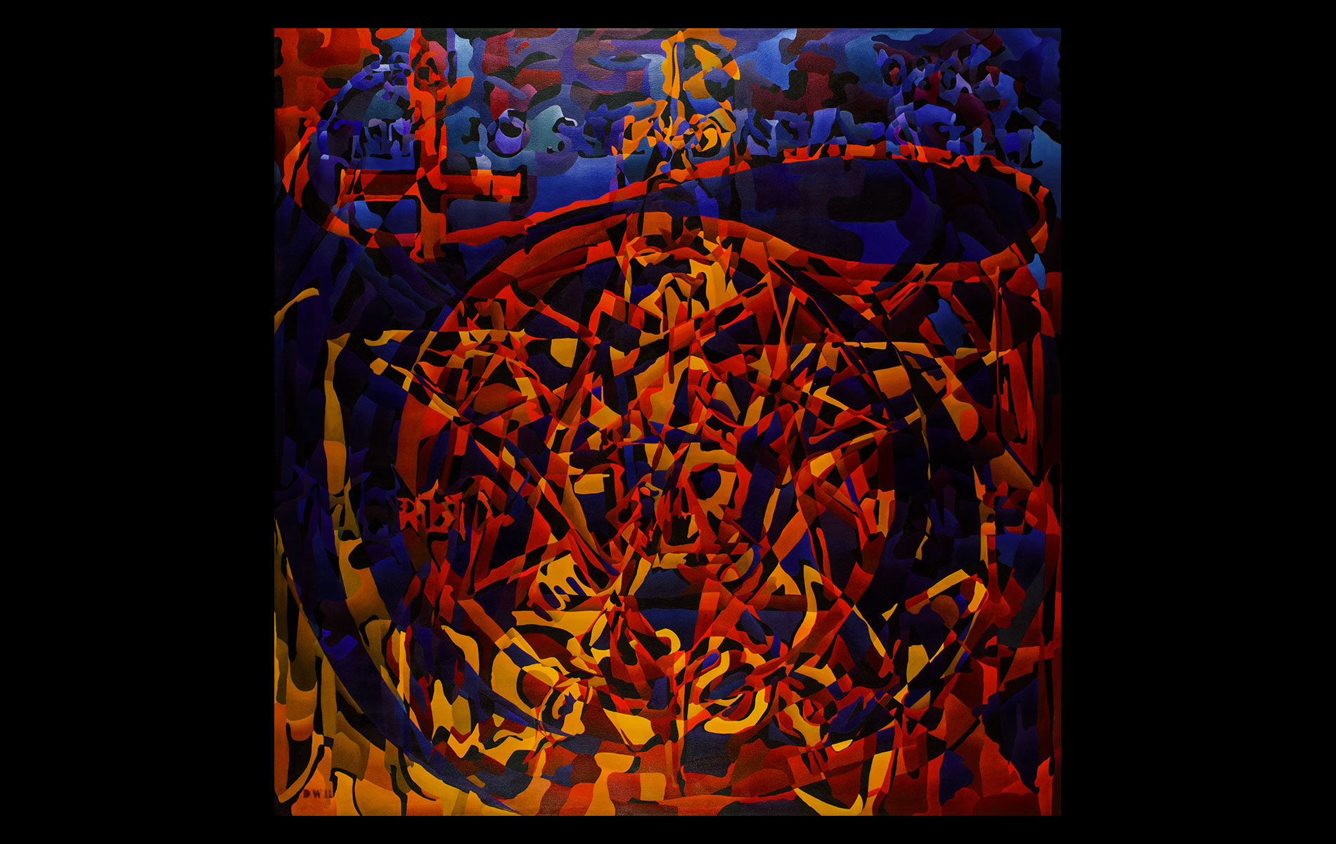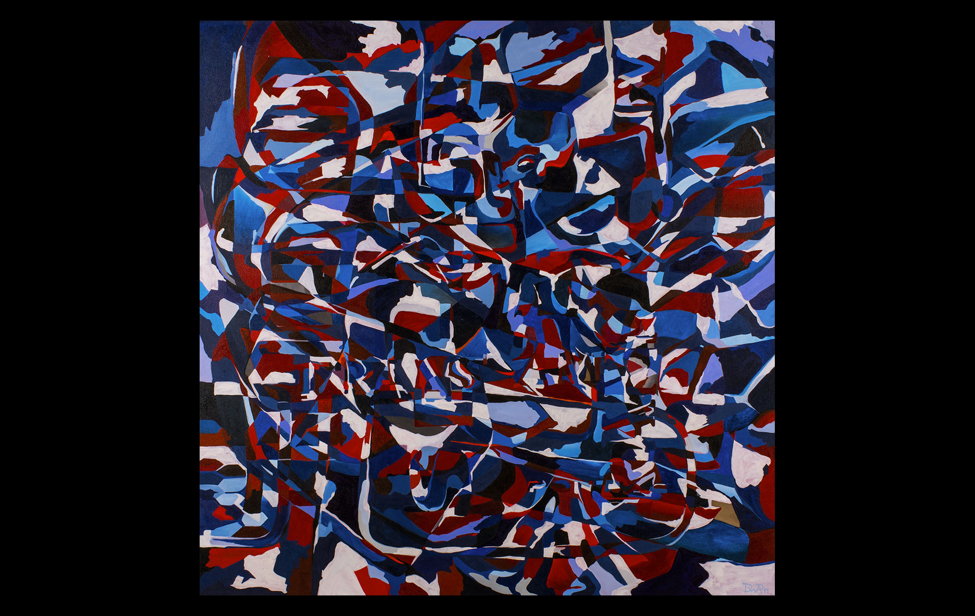 Uneventful childhood marked with sporadic bouts of non-conformity. A mutual agreement on behalf of the public school system led to over a decade of unfocused study amongst the academia of many universities. After receiving several degrees (Fine Art Painting, Art History and Computer Science) and completing requirements for many additional, he was forced into the outside world. That world involved several years of blind groping for a methodology that allowed an application of aesthetic skills while introducing complex literary and political ideas and experiences. Few levels of employment allow the freedom to create without restraint and some time was spent pursuing a state of compromise. Unfortunately, none was found satisfactory and the far too common life of the starving artist was accepted. Many mediums subjects and styles were attempted while striving for a evermore loose and expressive style. It wasn’t until realizing the futility of fighting his strengths and embracing the obsessive compulsive side, that a turning point was made. Since the epiphanal painting that coalesced the concept of “Contiguous Fractured Abstraction” it has been a struggle to prevent the temporal commitment from overwhelming the passion of intent. Due to the complexity of the work and the techniques involved, 4-6 months commitment is typical , while larger pieces can take as long as a year or more.