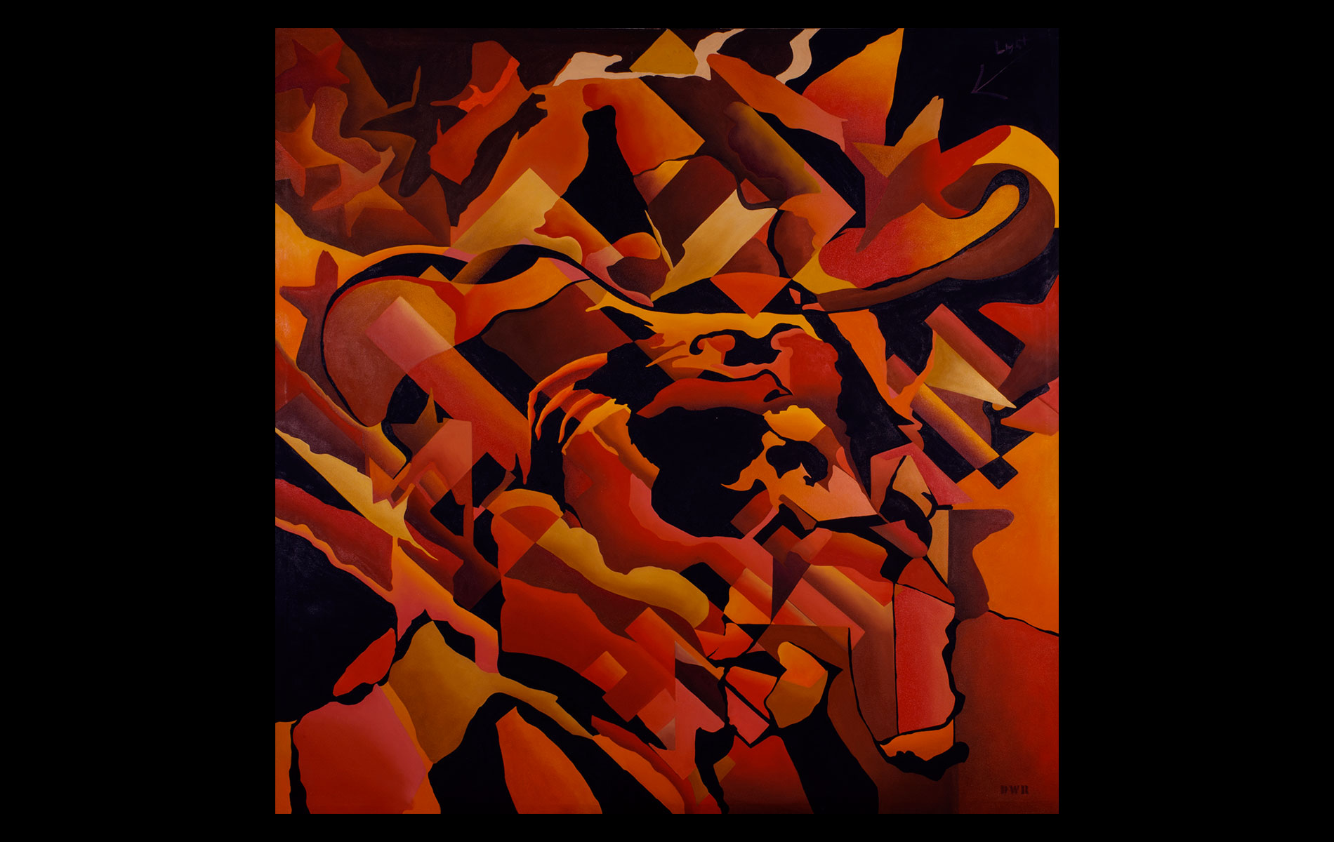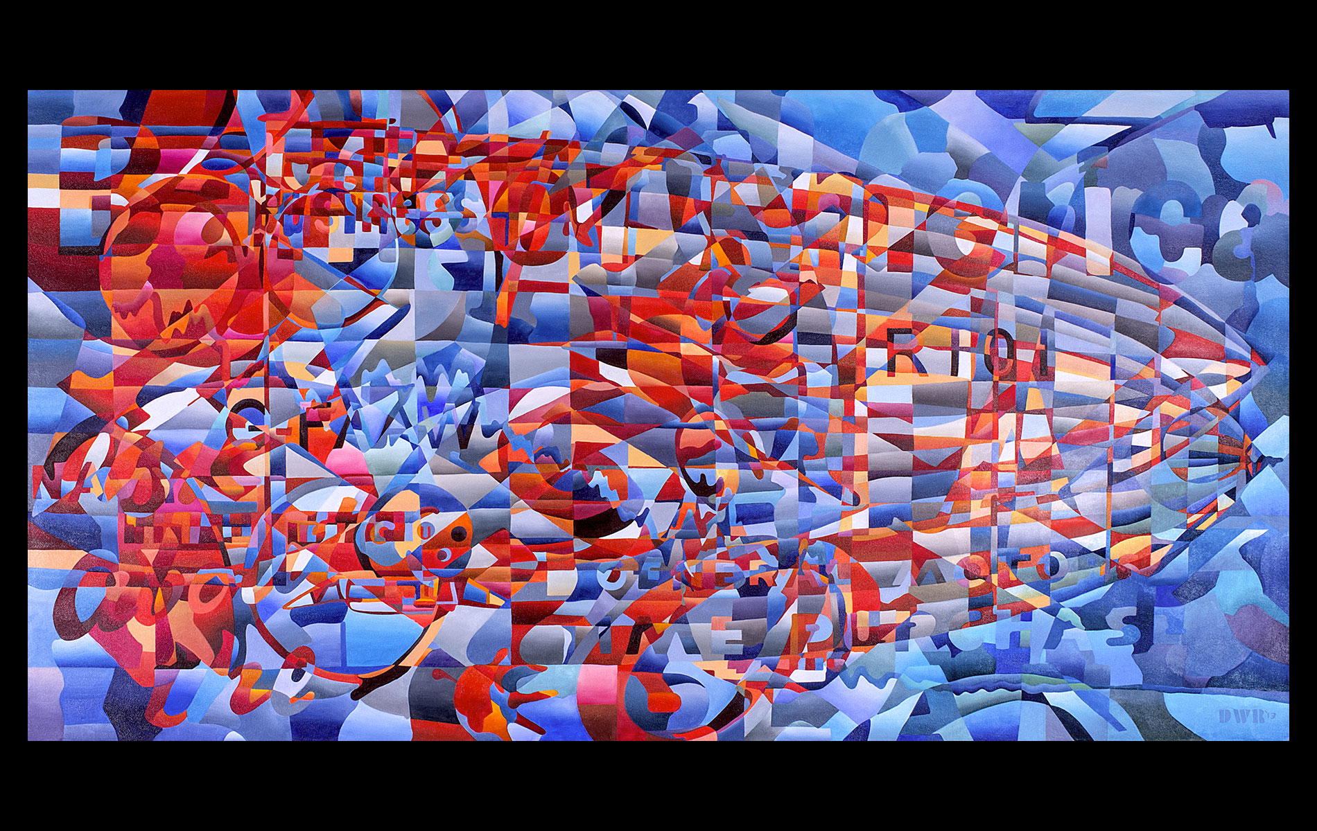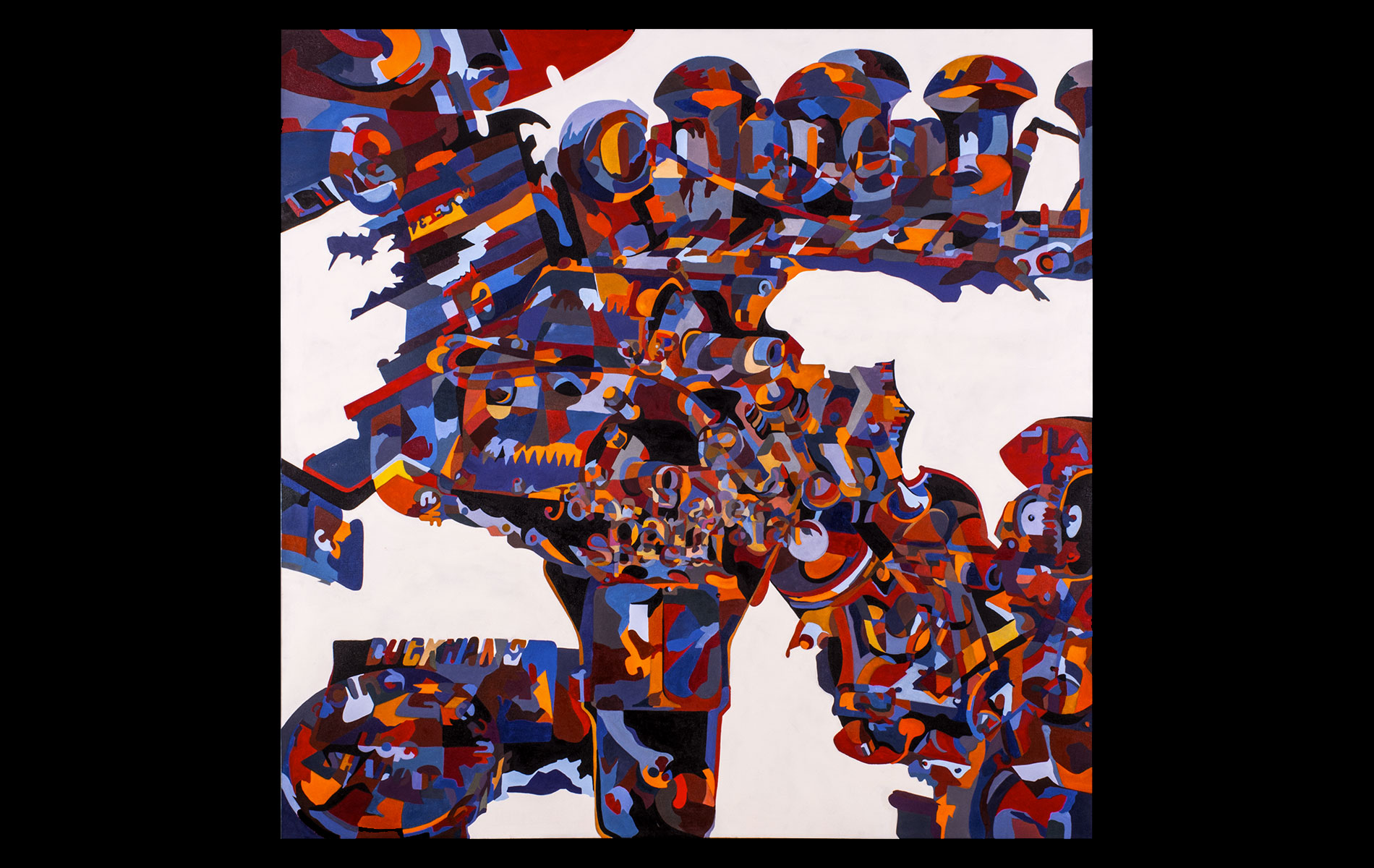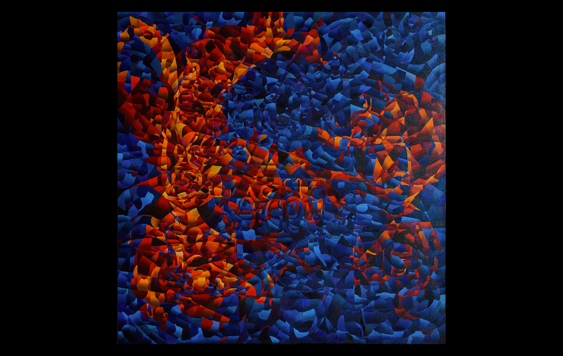 Uneventful childhood marked with sporadic bouts of non-conformity. A mutual agreement on behalf of the public school system led to over a decade of unfocused study amongst the academia of many universities. After receiving several degrees (Fine Art Painting, Art History and Computer Science) and completing requirements for many additional, he was forced into the outside world. That world involved several years of blind groping for a methodology that allowed an application of aesthetic skills while introducing complex literary and political ideas and experiences. Few levels of employment allow the freedom to create without restraint and some time was spent pursuing a state of compromise. Unfortunately, none was found satisfactory and the far too common life of the starving artist was accepted. Many mediums subjects and styles were attempted while striving for a evermore loose and expressive style. It wasn’t until realizing the futility of fighting his strengths and embracing the obsessive compulsive side, that a turning point was made. Since the epiphanal painting that coalesced the concept of “Contiguous Fractured Abstraction” it has been a struggle to prevent the temporal commitment from overwhelming the passion of intent. Due to the complexity of the work and the techniques involved, 4-6 months commitment is typical , while larger pieces can take as long as a year or more.