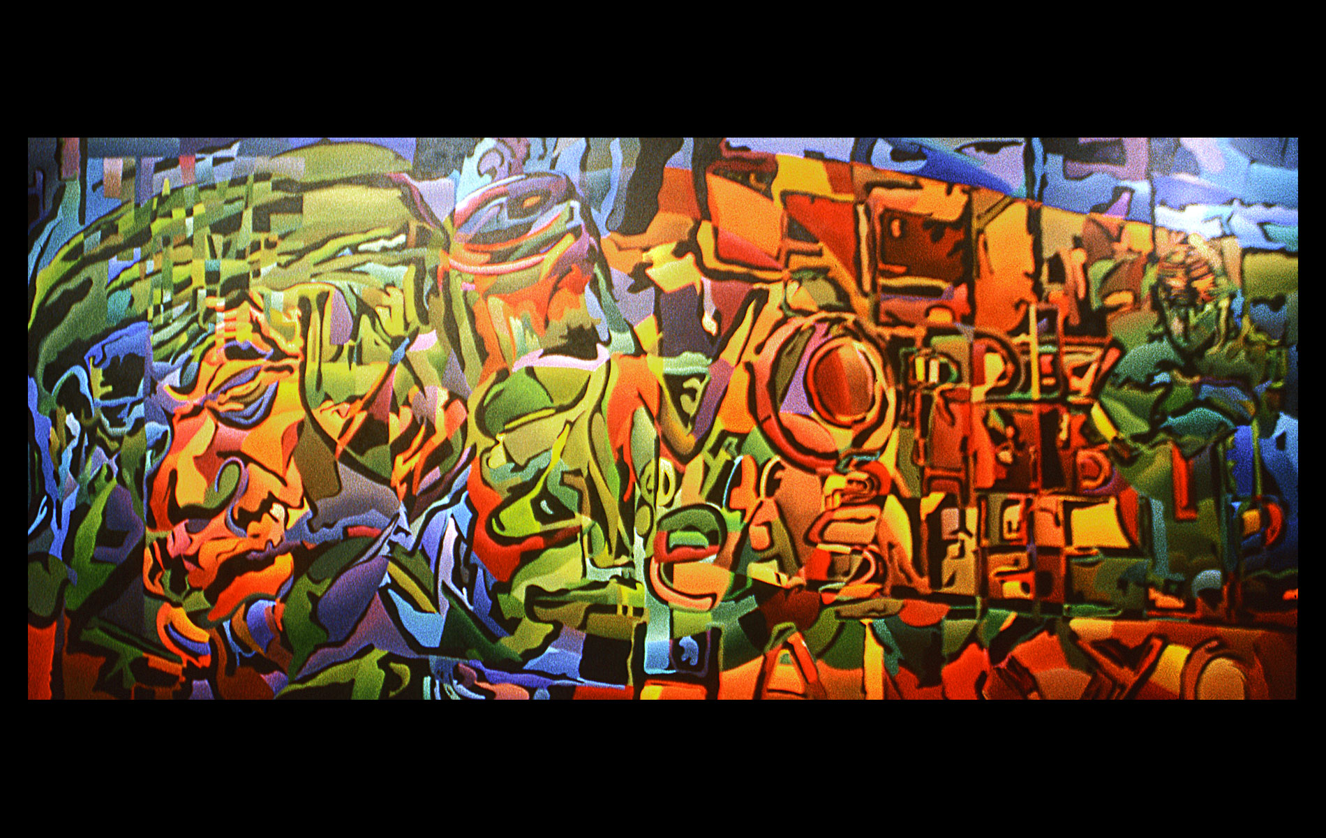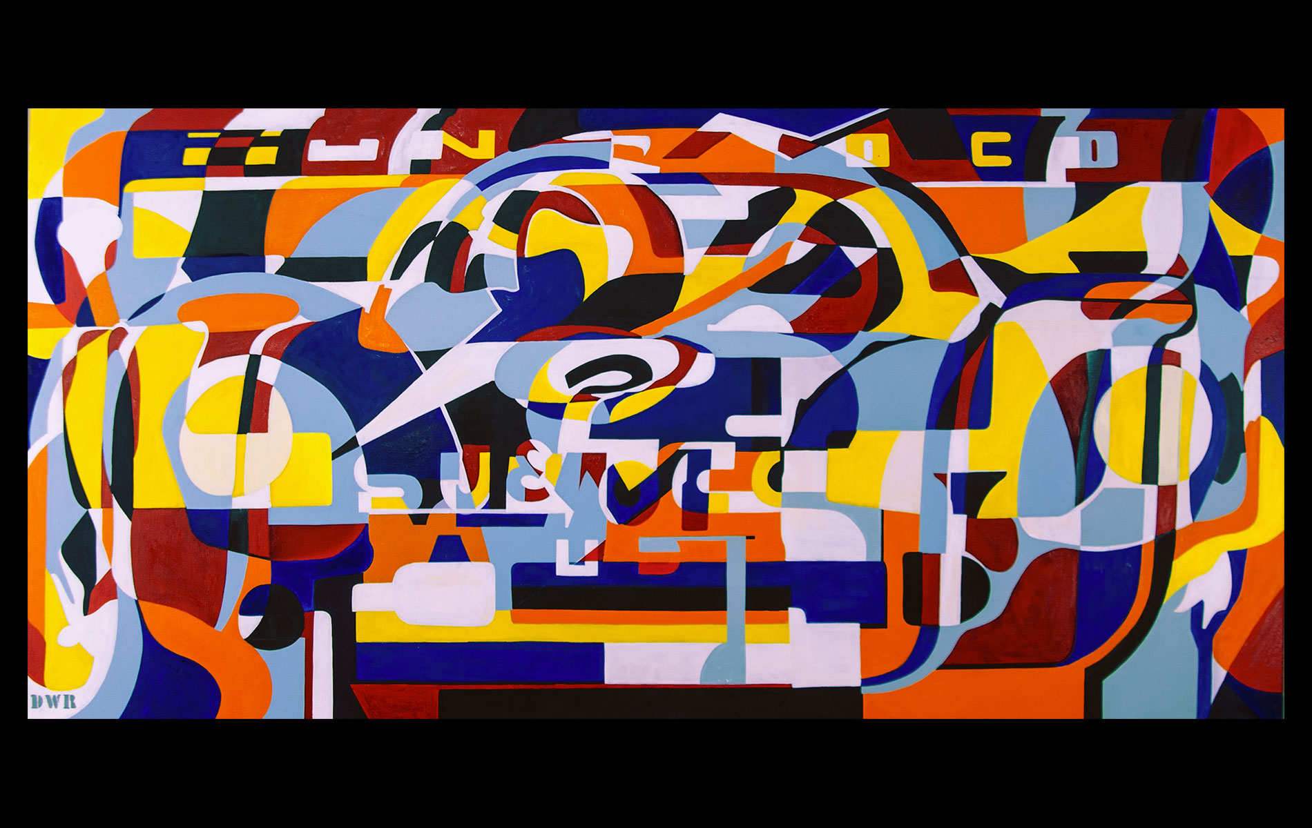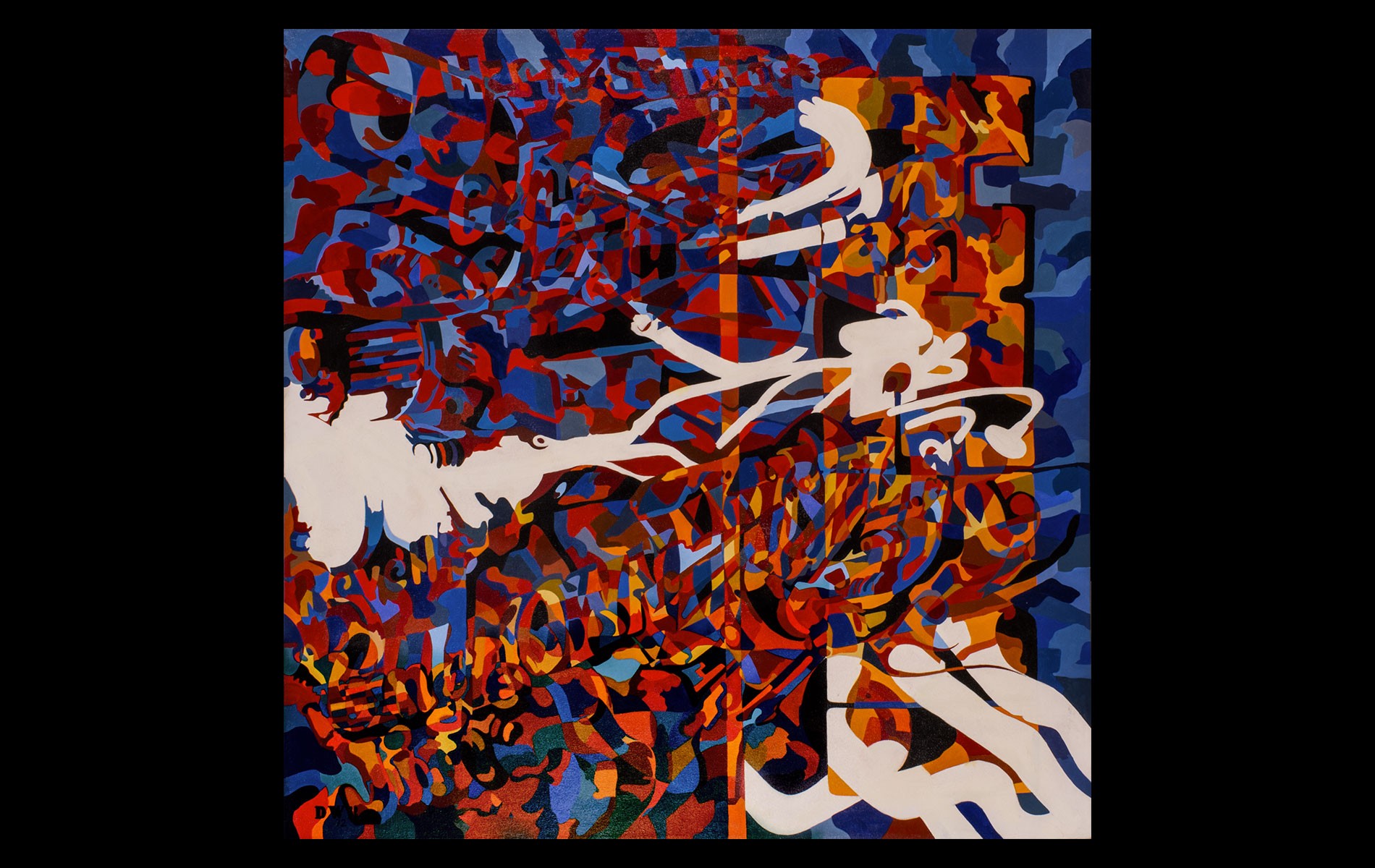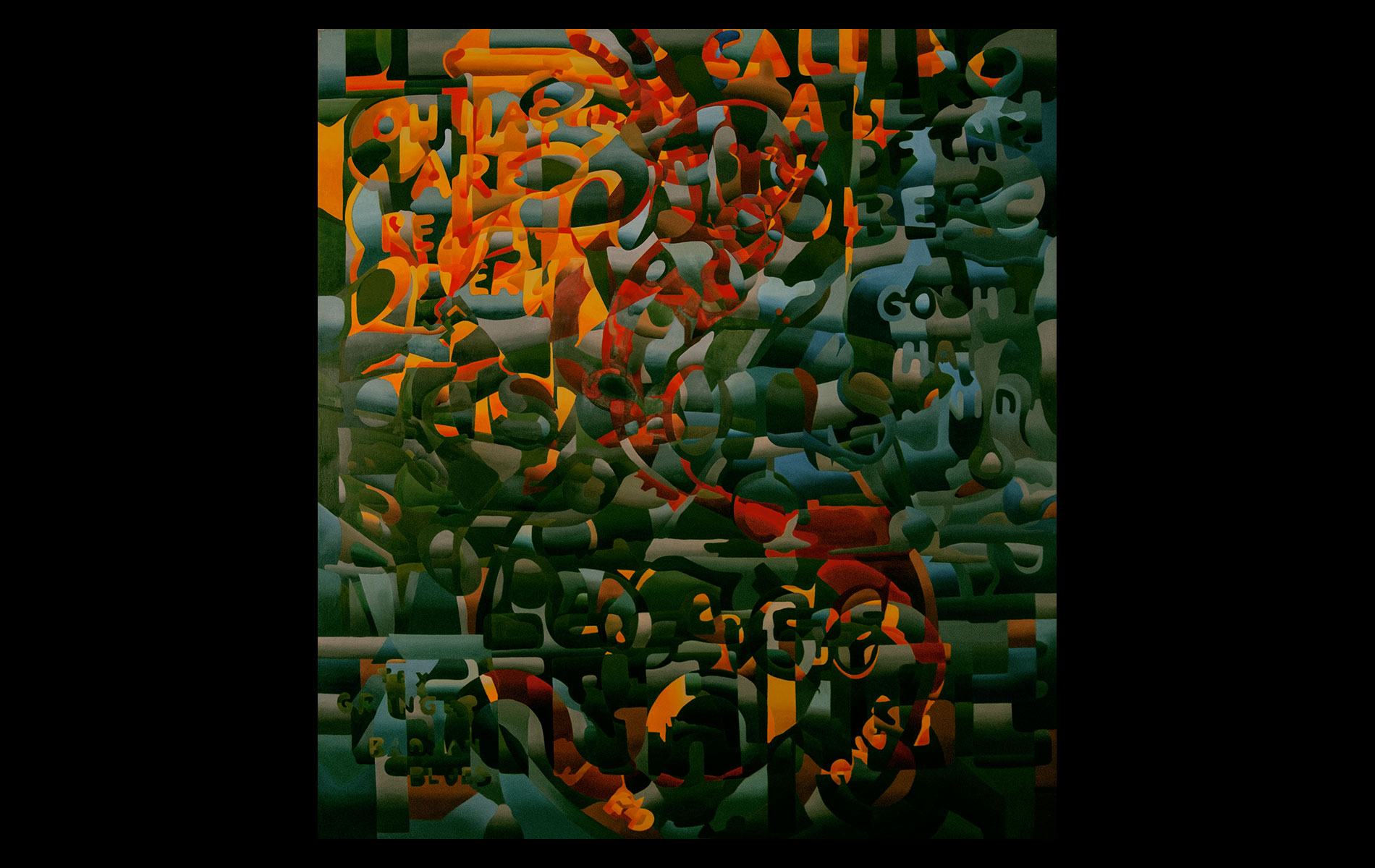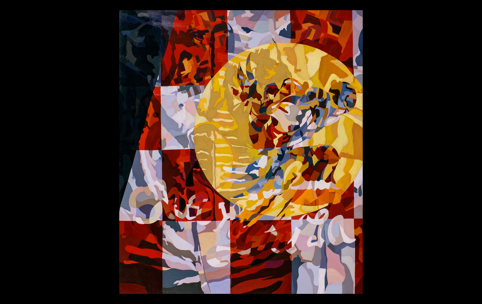 Uneventful childhood marked with sporadic bouts of non-conformity. A mutual agreement on behalf of the public school system led to over a decade of unfocused study amongst the academia of many universities. After receiving several degrees (Fine Art Painting, Art History and Computer Science) and completing requirements for many additional, he was forced into the outside world. That world involved several years of blind groping for a methodology that allowed an application of aesthetic skills while introducing complex literary and political ideas and experiences. Few levels of employment allow the freedom to create without restraint and some time was spent pursuing a state of compromise. Unfortunately, none was found satisfactory and the far too common life of the starving artist was accepted. Many mediums subjects and styles were attempted while striving for a evermore loose and expressive style. It wasn’t until realizing the futility of fighting his strengths and embracing the obsessive compulsive side, that a turning point was made. Since the epiphanal painting that coalesced the concept of “Contiguous Fractured Abstraction” it has been a struggle to prevent the temporal commitment from overwhelming the passion of intent. Due to the complexity of the work and the techniques involved, 4-6 months commitment is typical , while larger pieces can take as long as a year or more.